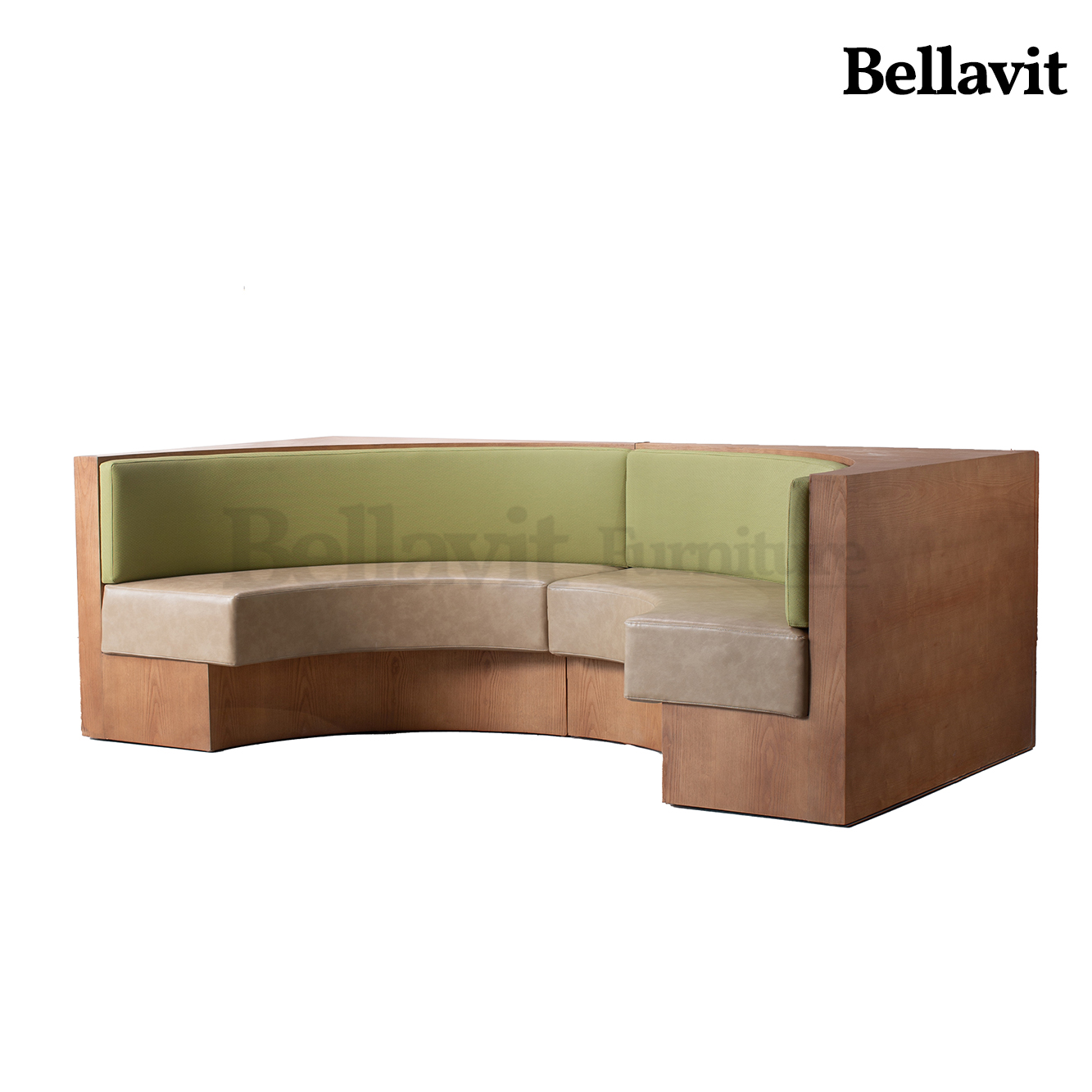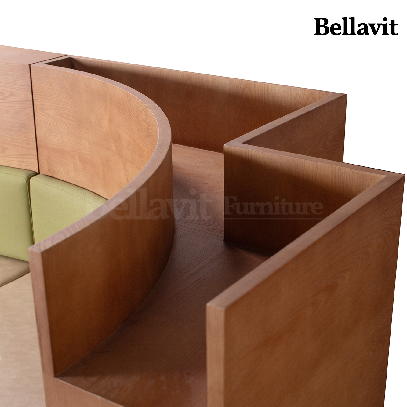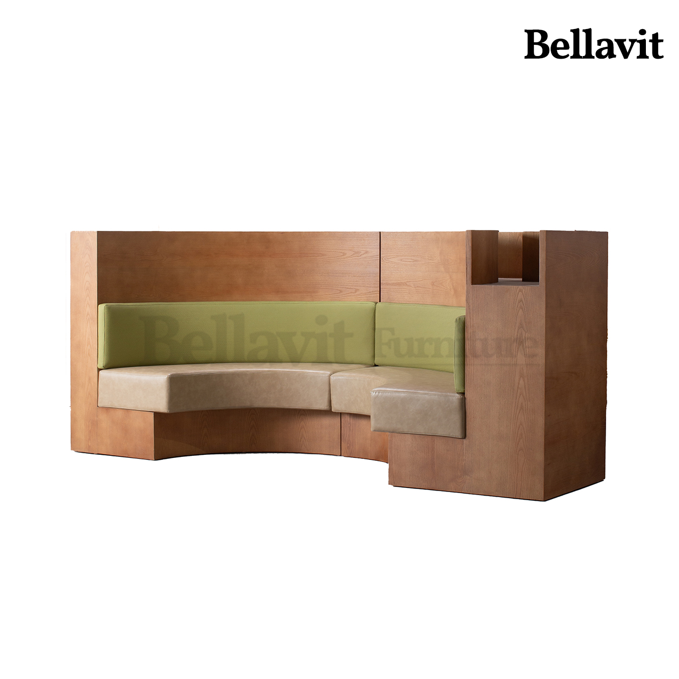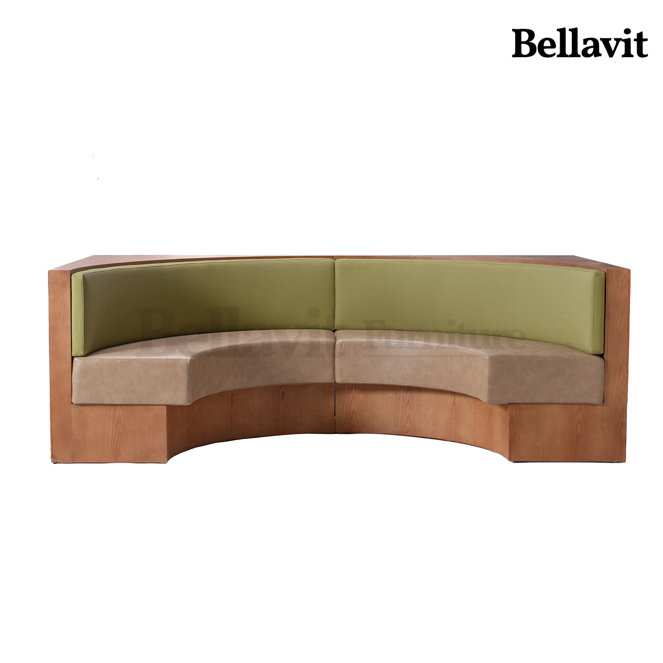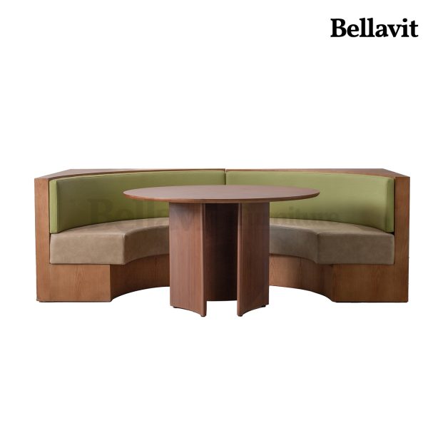 Wood-grain texture wraps you in natural warmth, while light khaki and olive-green leather upholstery gently caress your back and waist — this curved modular booth brings a sense of “effortless relaxation” directly into your space: Its semi-enclosed curve cocoons private chats in comfort, the dual-tone upholstery supports prolonged seating ease, and the modular design inherently fits diverse layouts. Every seat here is an embrace of gentle luxury.