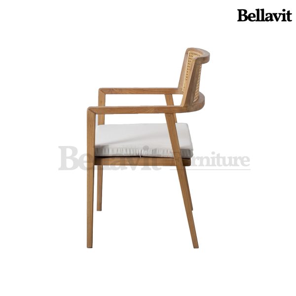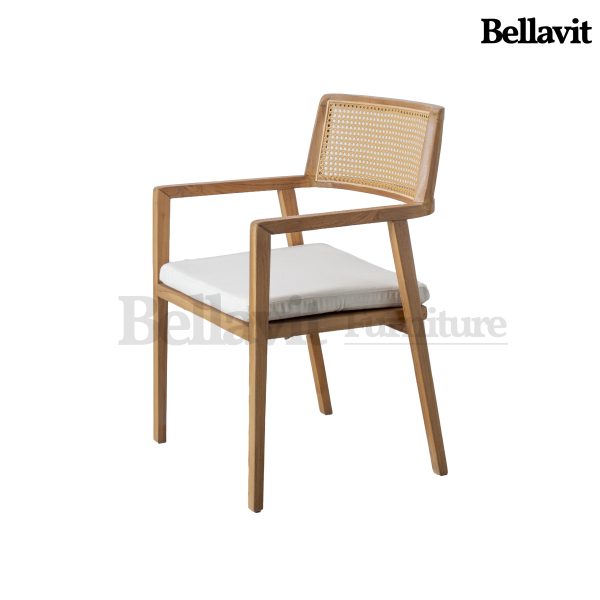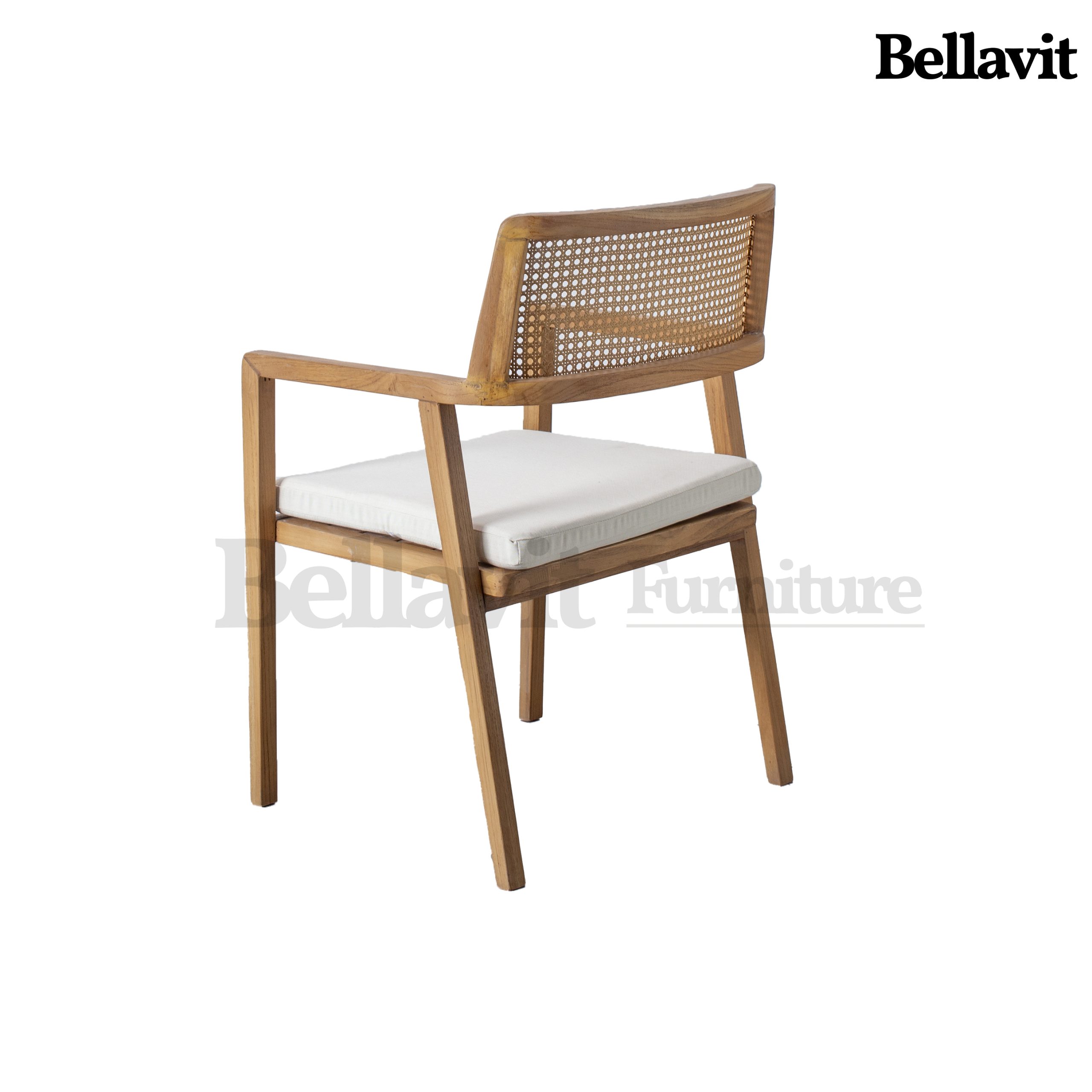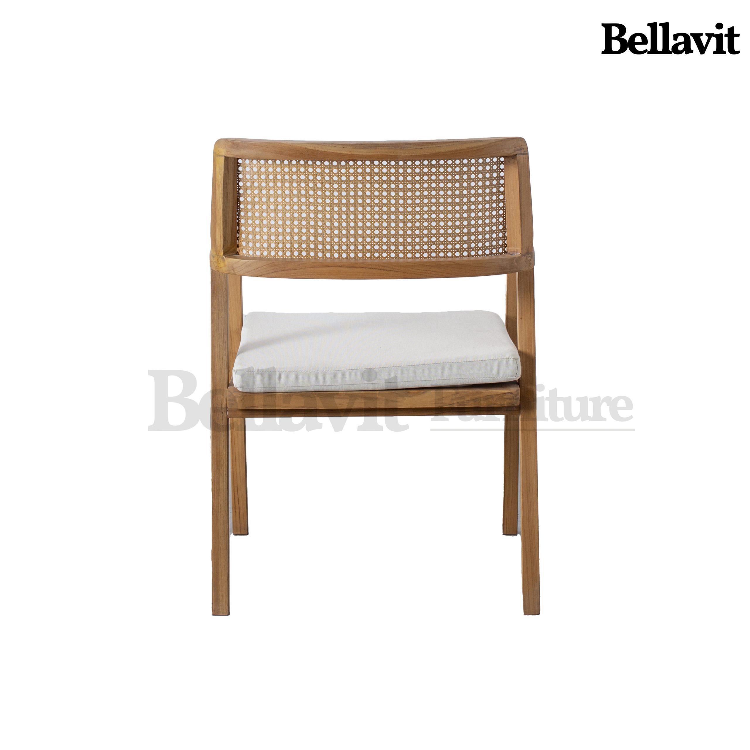 This is a solid teak dining chair that combines Southeast Asian-style rattan weaving craftsmanship, outdoor water-permeable sponge, and off-white outdoor fabric, creating an exceptionally relaxed and pleasant atmosphere.